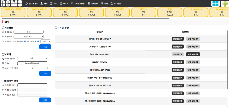 설정 메뉴는 현장명, 메인시작페이지, 경보설정, 보고서메일설정 등을 종합적으로 관리하는 메뉴입니다.