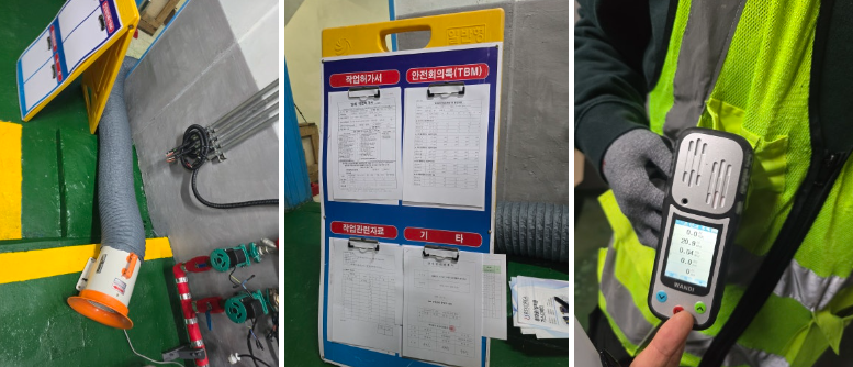 작업 시작 30분 전 밀폐공간을 개방하고 환기를 시켜야합니다. 송풍기를 설치하여 외부 산소를 유입 시킵니다. 안전 작업판을 설치하여 작업 관련자 외에 출입을 막고 안전 체크리스트를 수시로 작성합니다. 작업이 가능한 수준인지 밀폐공간 내 가스를 측정합니다.