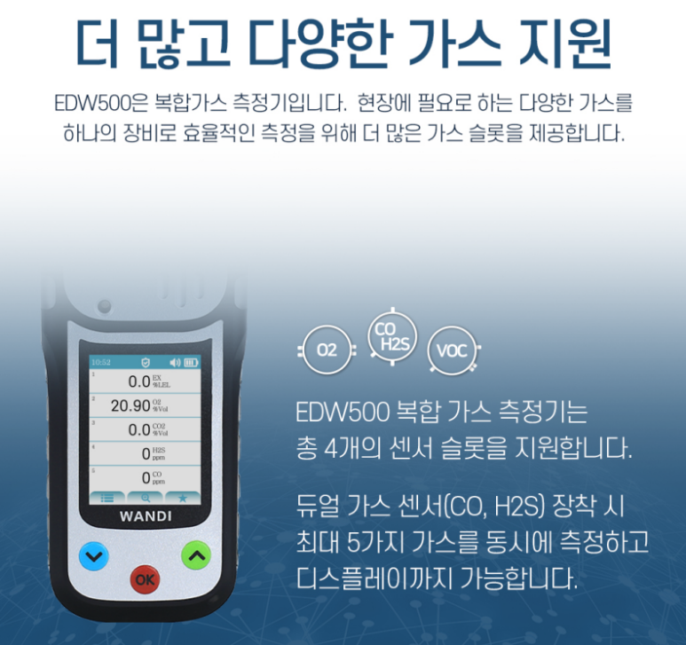 EDW500은 4개의 센서슬롯을 보유하고 있어서 한가지 센서로 두가지 가스를 측정하는 듀얼센서 장착 시 최대 5종의 가스를 동시에 측정할 수 있습니다.