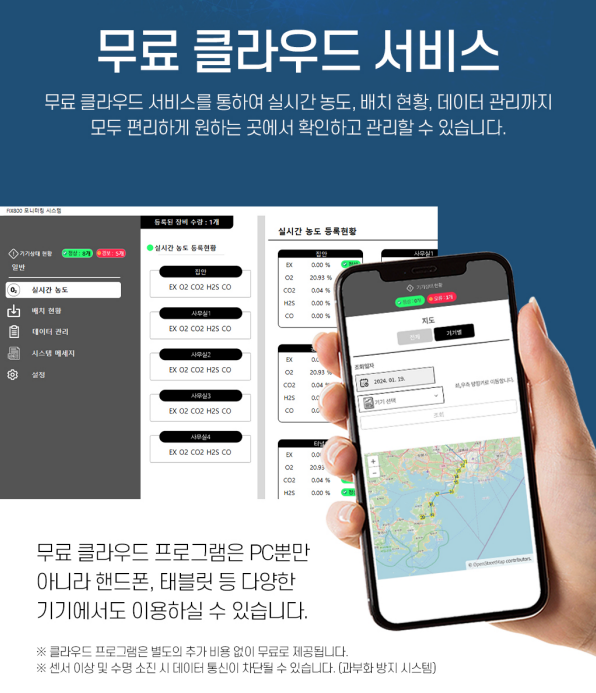 클라우드 서비스 DCMS를 통해서 실시간 가스농도 모니터링, 기기위치 확인, 데이터관리 등 다양한 IoT 기능을 이용하실 수 있어요
