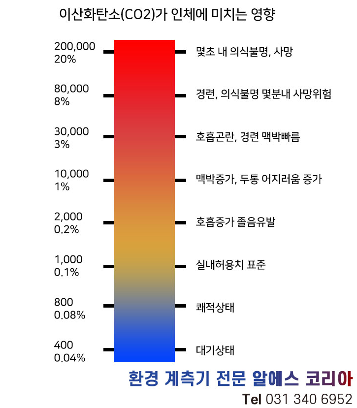 이산화탄소는 농도에 따라서 최대 사망에까지도 이르게 할 수 있는 위험한 가스로 안전관리가 필수입니다.